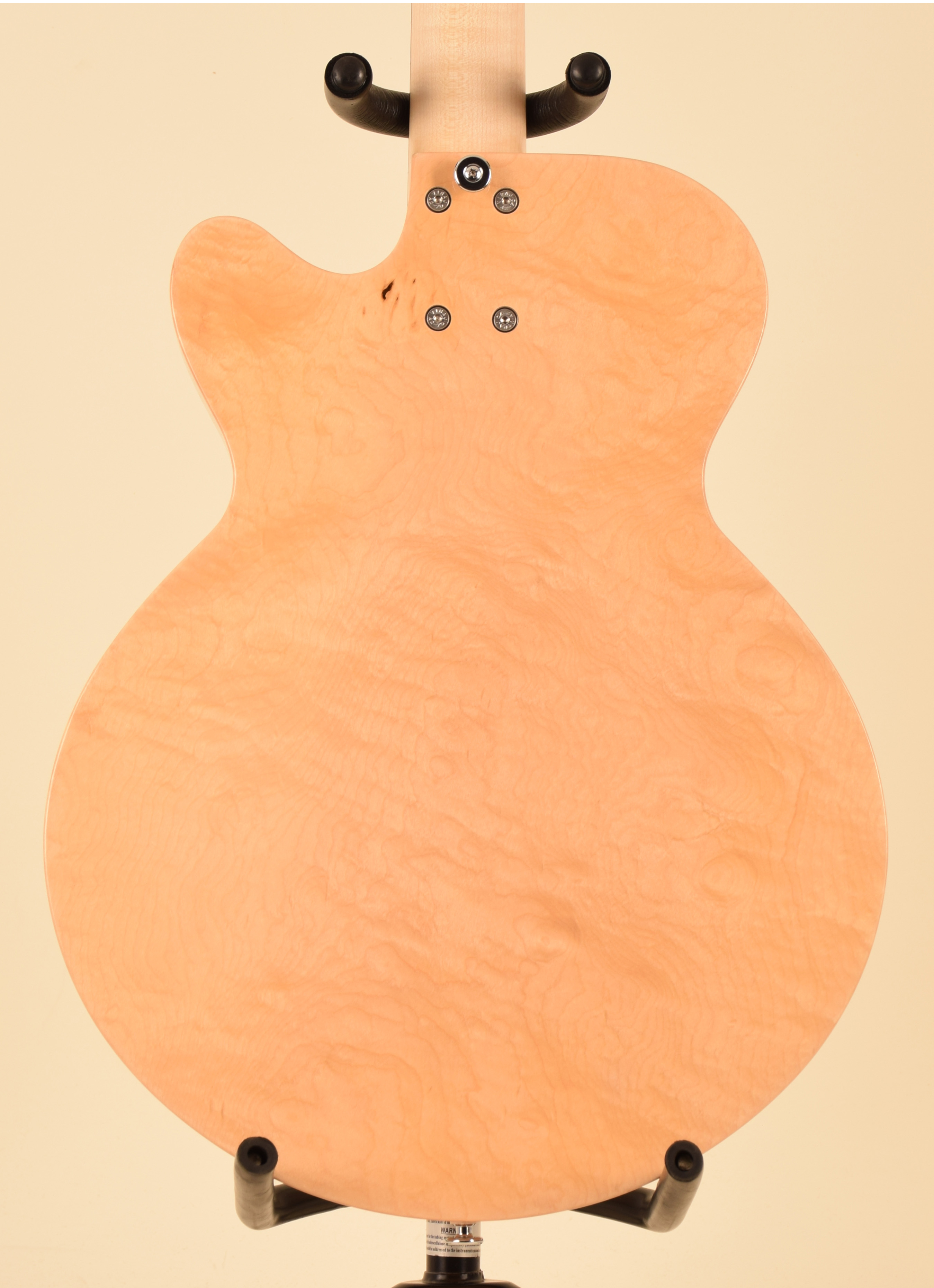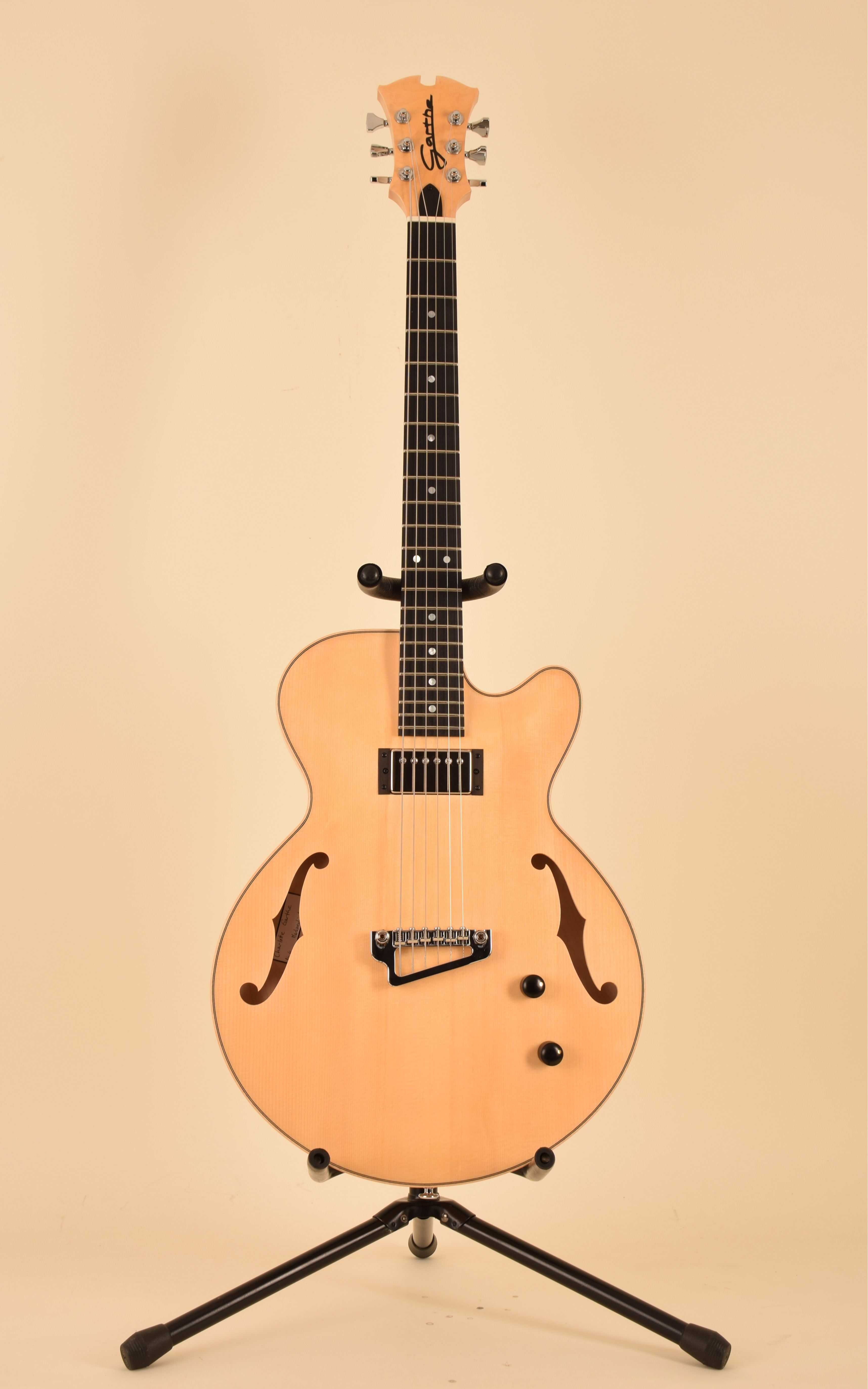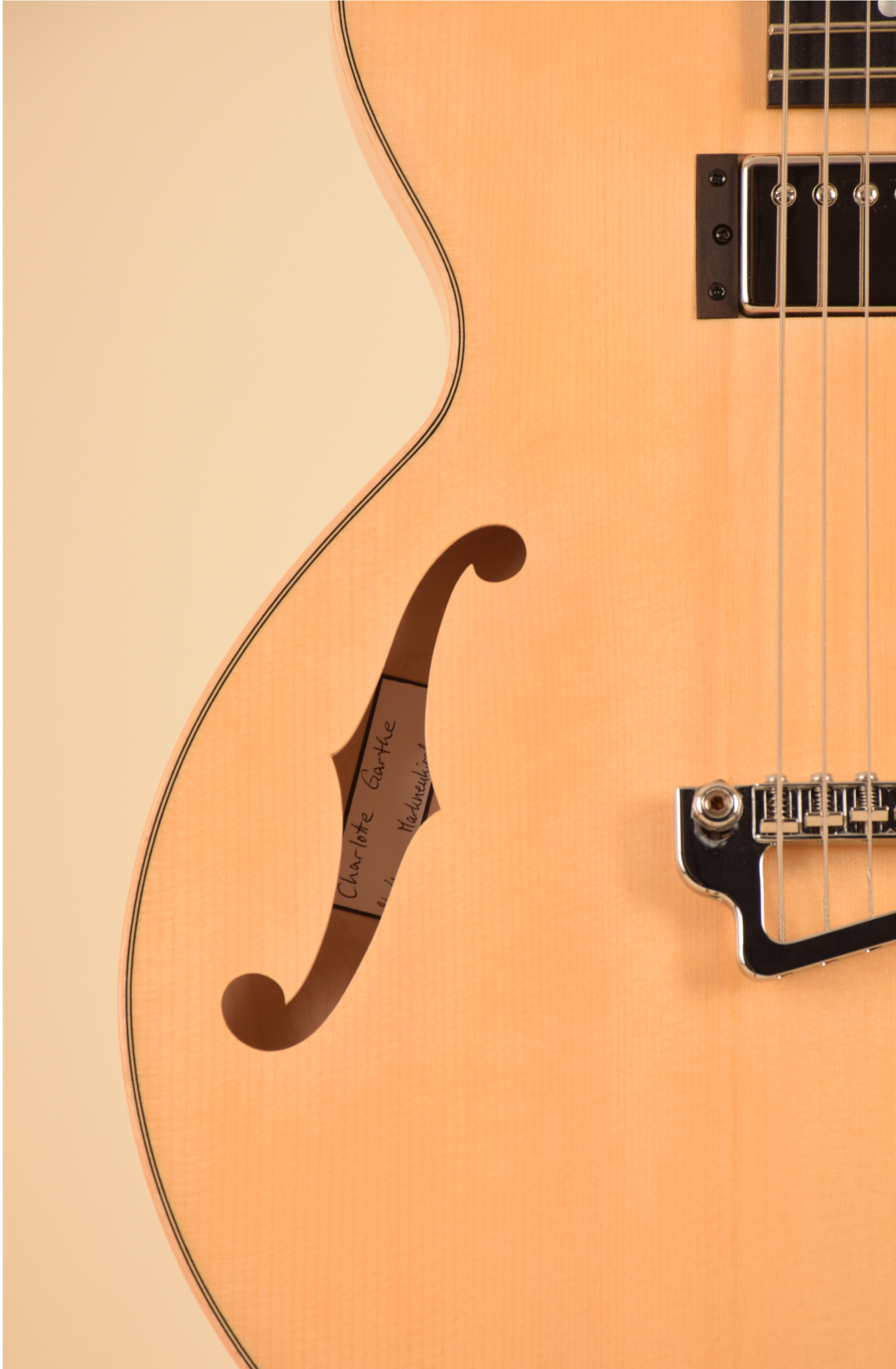 Eine Semiakustische Gitarre mit geschraubtem Hals, wodurch sie auch als Reisegitarre verwendet werden kann, da der Korpus in einen Handgepäckskoffer passt. Die gestochene Decke ist mit dem hohl ausgefrästen Boden verleimt. Der eingebaute Tonabnehmer ist ein Humbucker von Seymour Duncan, verbunden mit Volume- und Tone-Poti.