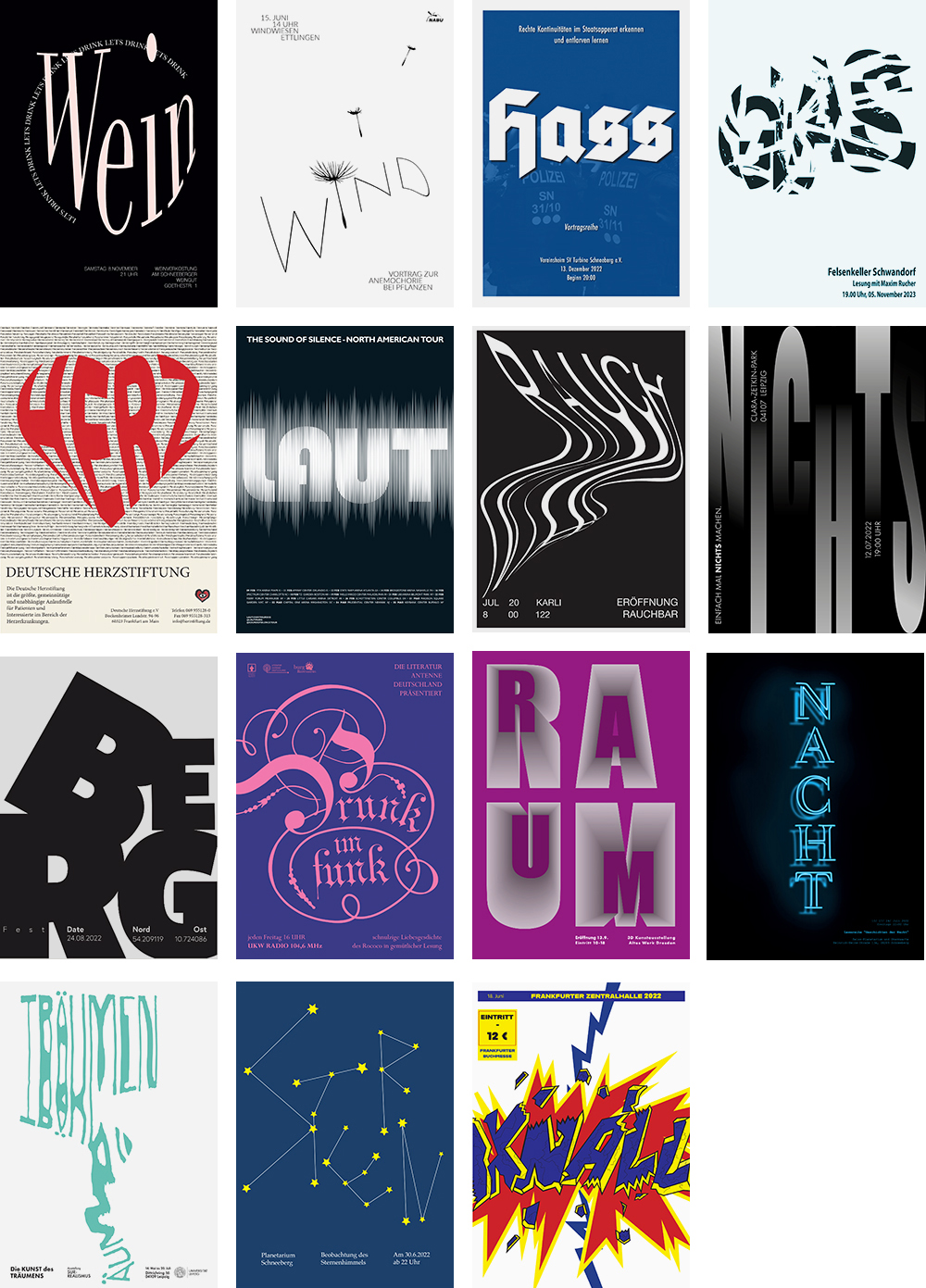 Die entstandenen Plakate sind fiktiven Veranstaltungen gewidmet, haben Fernwirkung und kommen ohne fotorealistische Bilder aus.