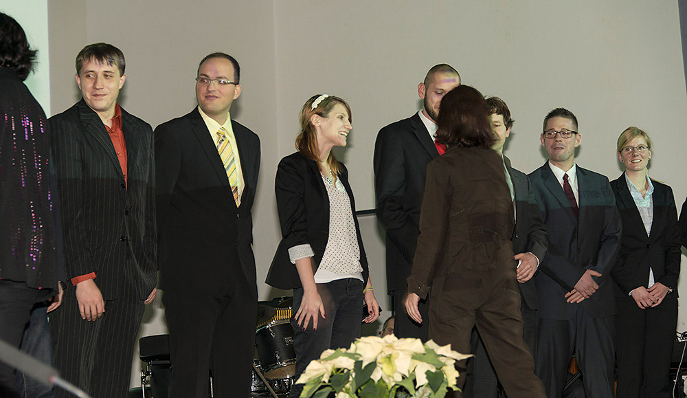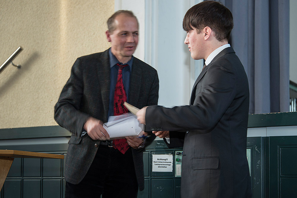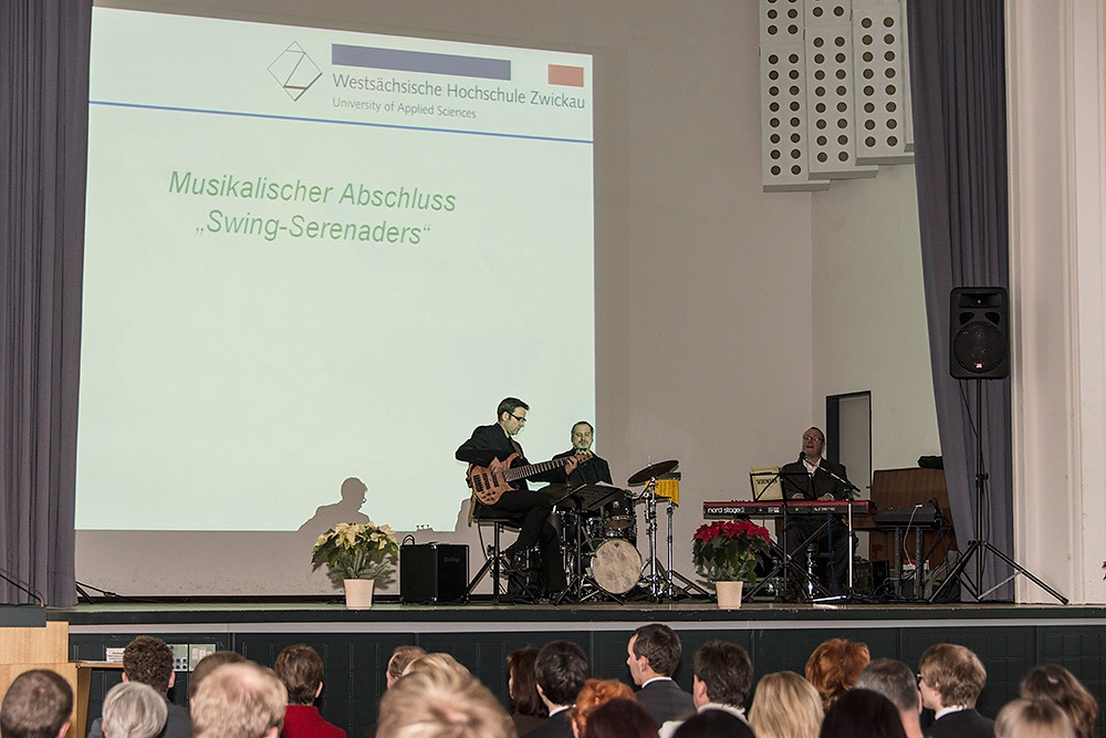 Als es dann endlich losging, bot sich ein Festakt, der seinem Namen alle Ehre machte. Reden, Auszeichnungen, Blumensträuße, Urkunden und als diesjährige musikalische Umrahmung ein Jazztrio des Robert-Schumann-Konservatoriums, die genauso wie die Nachwuchsband im letzten Jahr, sehr gut bei den jungen Absolventen ankam. Auch der durch die Musiker mit Hintergrundmusik begleitete Höhepunkt der Veranstaltung - die Zeugnisübergabe - bildete einen würdigen Rahmen.