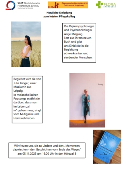 Frau Antje Mögling, Diplompsychologin und Psychoonkologin liest aus ihrem neuen Buch vor und gibt uns Einblicke in die Begleitung schwerkranker und sterbender Menschen. Begleitet wird sie von Frau Julia Jünger, einer Musikerin aus Leipzig. In melancholischen Popsongs erzählt sie darüber, dass man im Leben „all in“ gehen muss, singt vom Mutigsein und Heimweh haben.