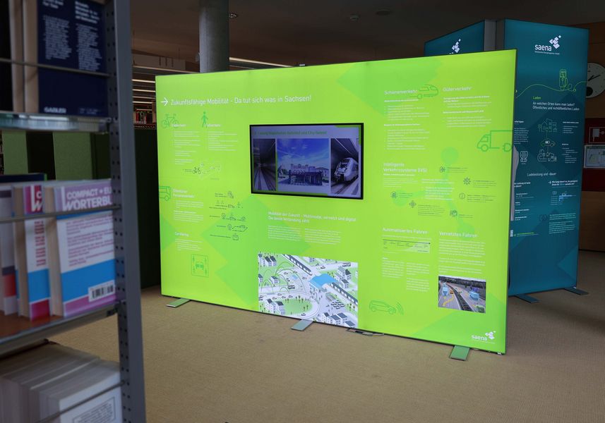 Ein Highlight der Mobilitätstage gibt es bereits jetzt zu sehen. Am 02. Juni 2025 wurde die Wanderausstellung "Effiziente Mobilität Sachsen" in der Hochschulbibliothek in Zwickau durch die Oberbürgermeisterin Constance Arndt eröffnet. Mobilitätsberater Sebastian Henning von der SAENA GmbH stellte ihr und der Prorektorin für Bildung Prof. Dr. Anke Häber die Ausstellung vor. Mit zwei Schautafeln und einem Turm lädt diese zum Entdecken der Themen "Elektromobilität", "Intelligente Verkehrssysteme" und "Mobilität der Zukunft" ein. Zahlreiche neue Grafiken, Bilder und digitale Elemente informieren hierzu und stellen dabei den Bezug zur regionalen Situation im Freistaat Sachsen her.