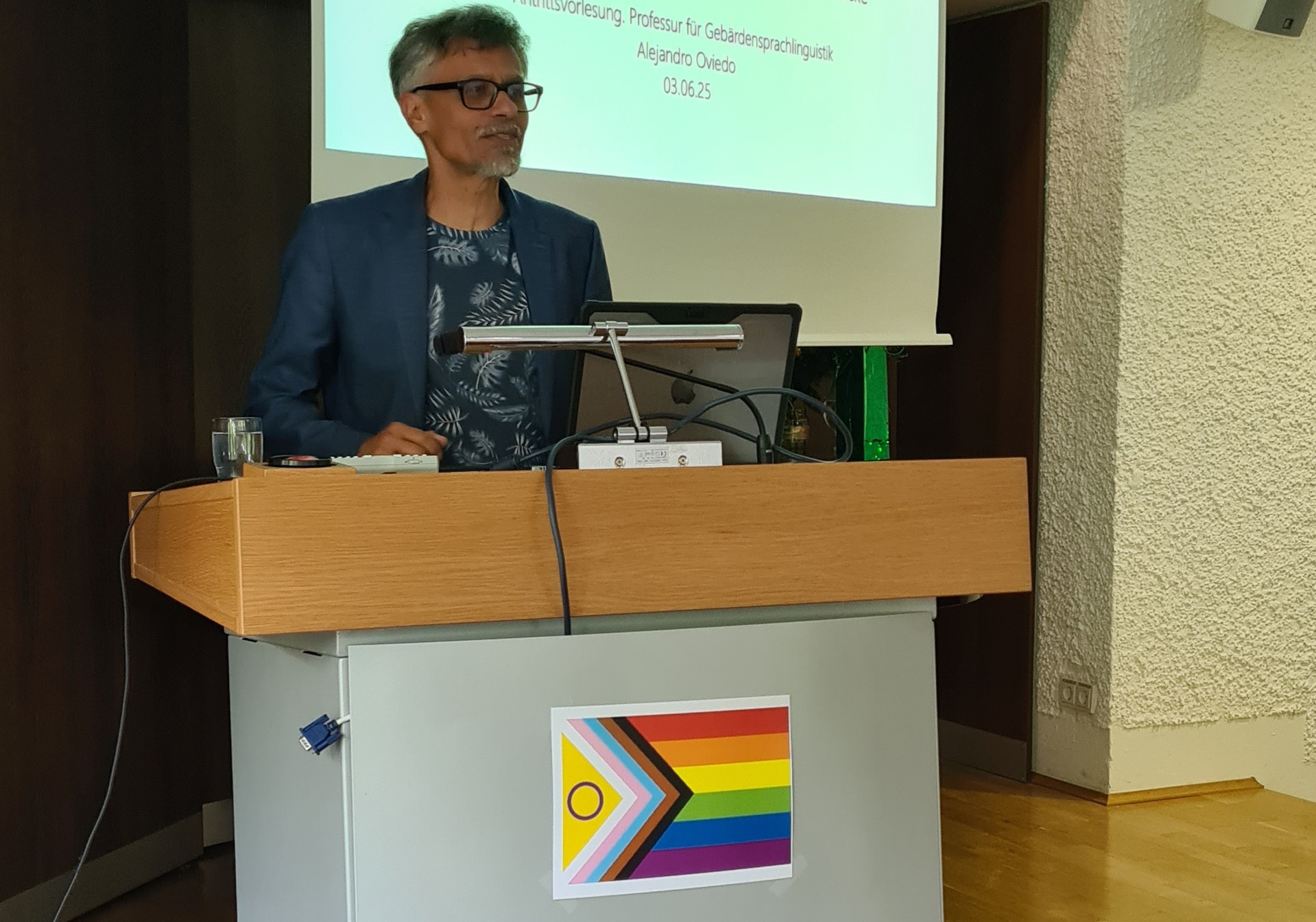 Prof. Alejandro Oviedo, der 2019 erstmals auf die Professur Gebärdensprachlinguistik berufen wurde, holte seine durch die Pandemie verhinderte Antrittsvorlesung nach. Unter dem Thema „Bedarfsanalyse und aufgabenbasiertes Lernen für die Entwicklung und Umsetzung eines berufsbegleitenden L2-Trainingsprogramms in DGS für besondere Zwecke“ stellte Prof. Oviedo seine Forschungen zu dem Projekt BeQuiS - Berufsbegleitende DGS-Qualifikation in Sachsen vor, das er an der WHZ etabliert hat und in dessen Rahmen er den weiterbildenden Master Angewandte Deutsche Gebärdensprache zunächst als Pilotprojekt vor zwei Jahren startete. Er zeigte zum einen den erhobenen hohen Bedarf an berufsbegleitender Ausbildung in Gebärdensprache für zahlreiche Berufsgruppen auf, zum anderen die Herausforderungen, die bezüglich einer noch zu entwickelnden Didaktik und Lehrmaterialien der Deutschen Gebärdensprache für berufliche Kontexte bestehen. Die ersten Evaluierungen bei den Teilnehmenden des berufsbegleitenden Masters, die Prof. Oviedo präsentierte, zeigten bei der Pilotgruppe durch das Studium einen deutlichen Zuwachs an Berufszufriedenheit und Kompetenz in der Beratung Gehörloser.