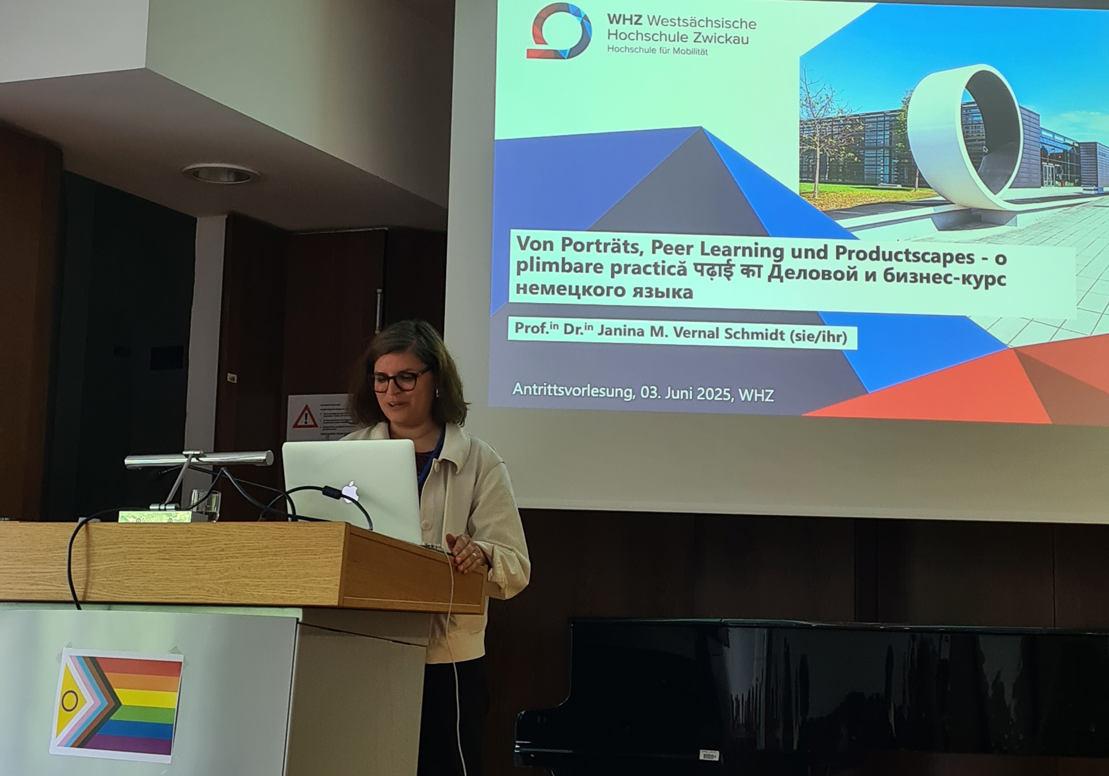 Die zweite Antrittsvorlesung hielt Frau Prof.in Janina Vernal Schmidt, die 2023 auf die neu geschaffene Professur für Deutsch als Fremd- und Fachsprache mit dem Schwerpunkt Wirtschaftskommunikation im multilingualen Kontext berufen wurde. Unter dem multilingualem Titel: „Von Porträts, Peer Learning und Productscapes - o plimbare practică पढ़ाई का Деловой и бизнес-курс немецкого языка“ zeigte sie u.a. verschiedene innovative didaktische Ansätze in ihrem Lehrgebiet auf. Besonders interessant erschienen dabei solche, die die Studierenden durch eigene kleinere Forschungsprojekte beispielsweise zur Linguistic Landscape in Zwickau zu forschenden Lernenden macht und damit zeitgemäß die Humboldtsche Idee der Einheit von Forschung und Lehre umsetzen und kritisches Denken als Grundhaltung entwickeln. Damit werden Studierende, die aus anderen Wissenschaftssystemen kommen, entdeckend mit dem in der Humboldtschen Tradition stehenden deutschen Ansatz vertraut gemacht.