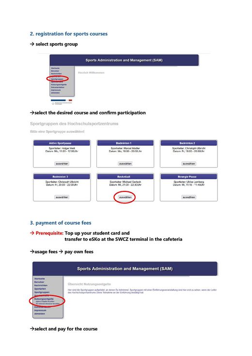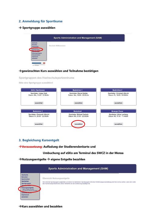 Wer im Wochen- oder Trainingsplan eine Sportgruppe seiner Wahl gefunden hat, meldet sich in unserem Sports Administrations and Management System (SAM) vor Teilnahme an. Nur so ist gewährleistet, dass sich unsere Übungsleiter adäquat auf euch vorbereiten können und euch das bieten, was ihr erwartet.