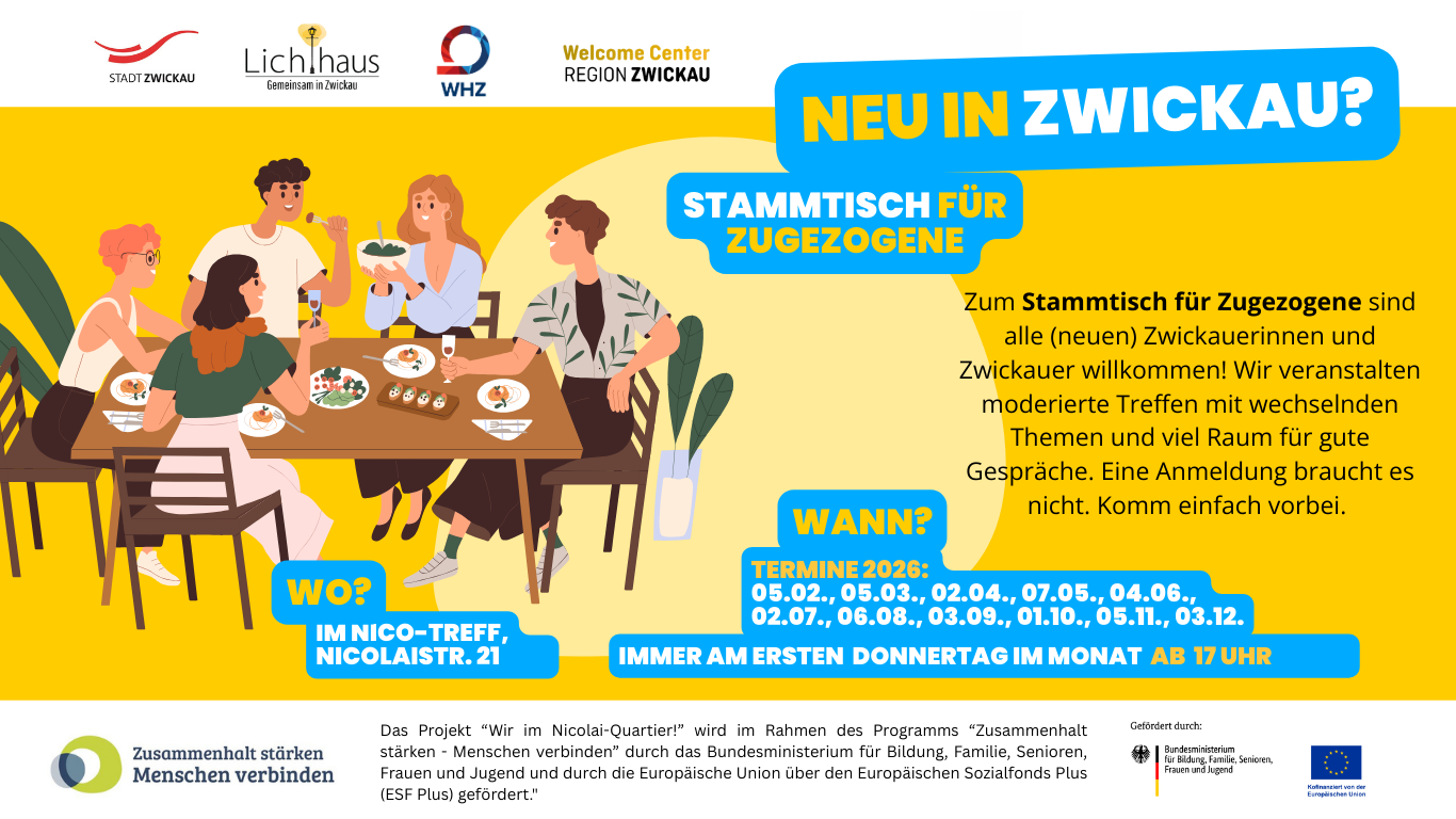 Dieses offene Treffen richtet sich an alle neuen Zwickauerinnen und Zwickauer, die Lust haben, sich zu vernetzen, ins Gespräch zu kommen und die Stadt besser kennenzulernen. Der Stammtisch bietet moderierte Treffen mit wechselnden Themen und viel Raum für gute Gespräche in entspannter Atmosphäre. Eine Anmeldung ist nicht erforderlich, einfach vorbeikommen und mitmachen!