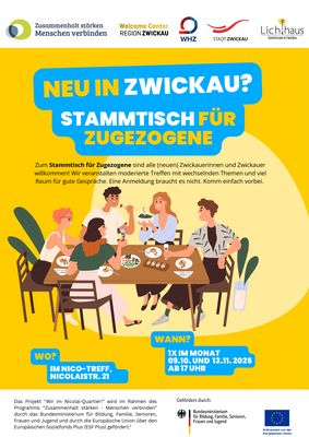 Dieses offene Treffen richtet sich an alle neuen Zwickauerinnen und Zwickauer, die Lust haben, sich zu vernetzen, ins Gespräch zu kommen und die Stadt besser kennenzulernen. Der Stammtisch bietet moderierte Treffen mit wechselnden Themen und viel Raum für gute Gespräche in entspannter Atmosphäre. Eine Anmeldung ist nicht erforderlich, einfach vorbeikommen und mitmachen!